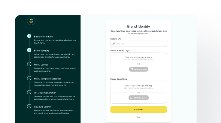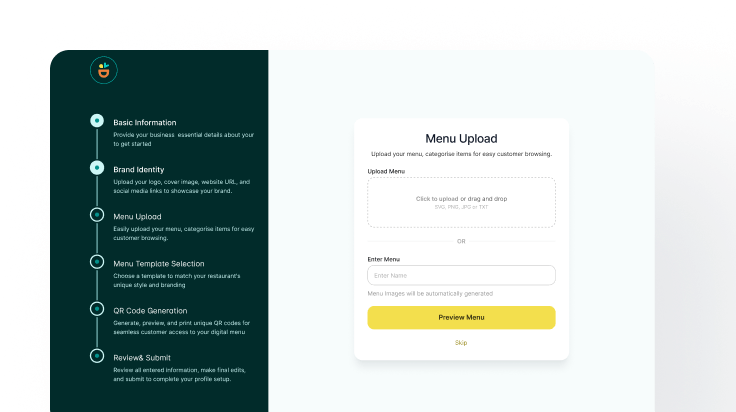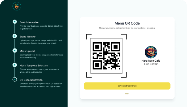 Sign up, fill in your restaurant details, and upload your menu items quickly and easily. Generate unique QR codes for each table, print, and place them on tables. No technical expertise required. Our support team is always available to assist you